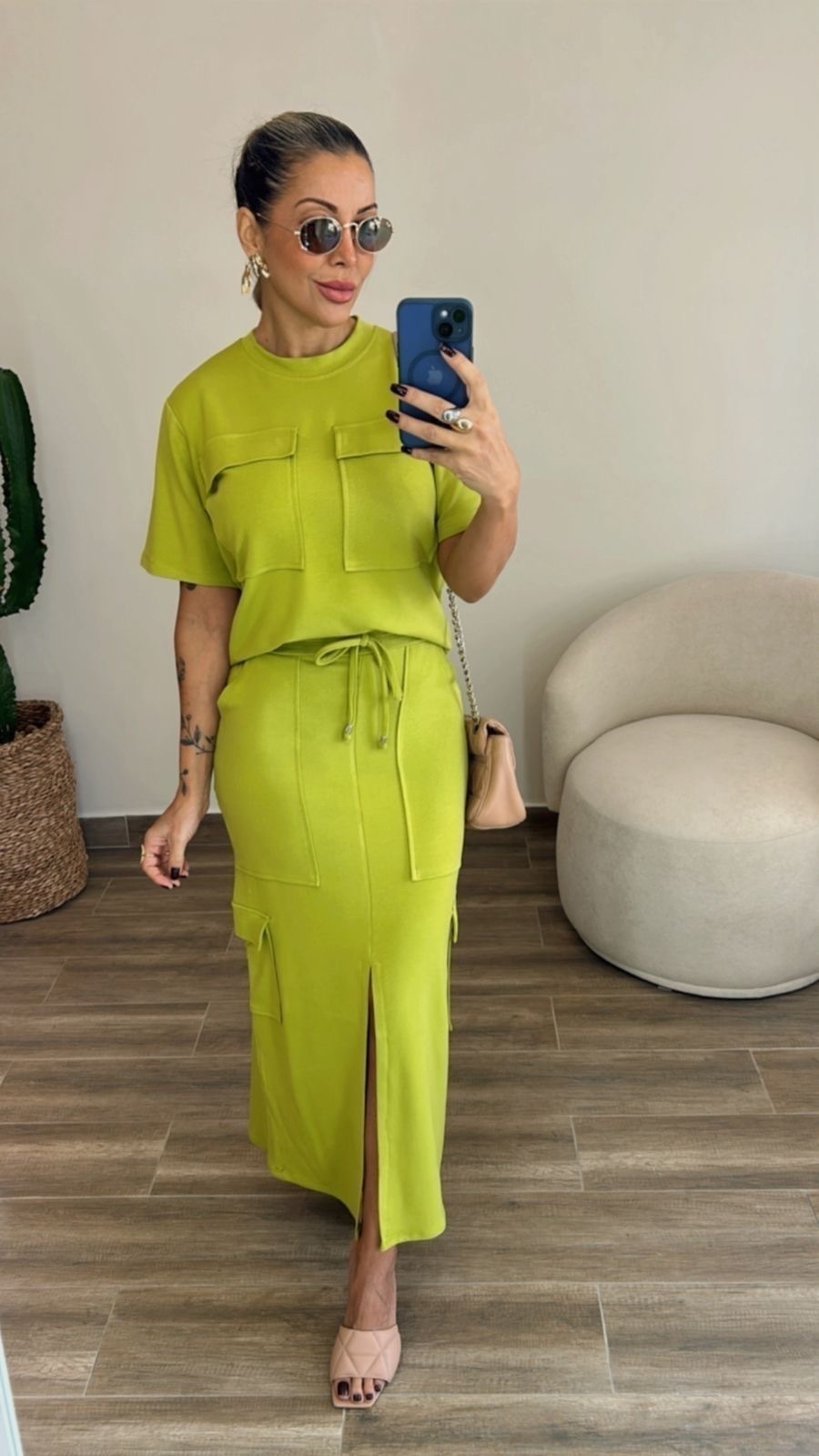 Saia com elástico na cintura, bolso cargo e nas laterais e fenda frontal