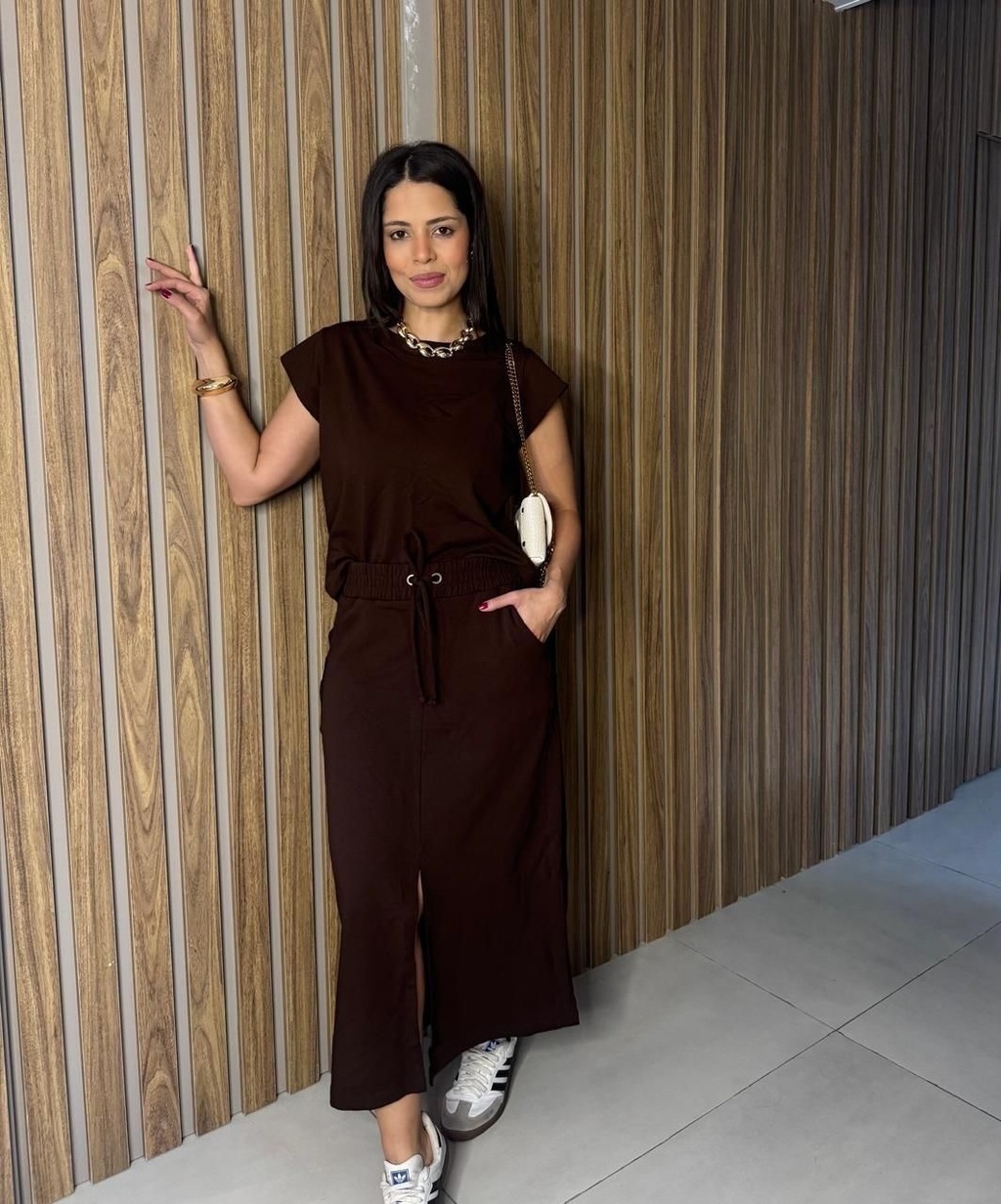 Saia com elástico na cintura, bolsos, fenda e ilhos