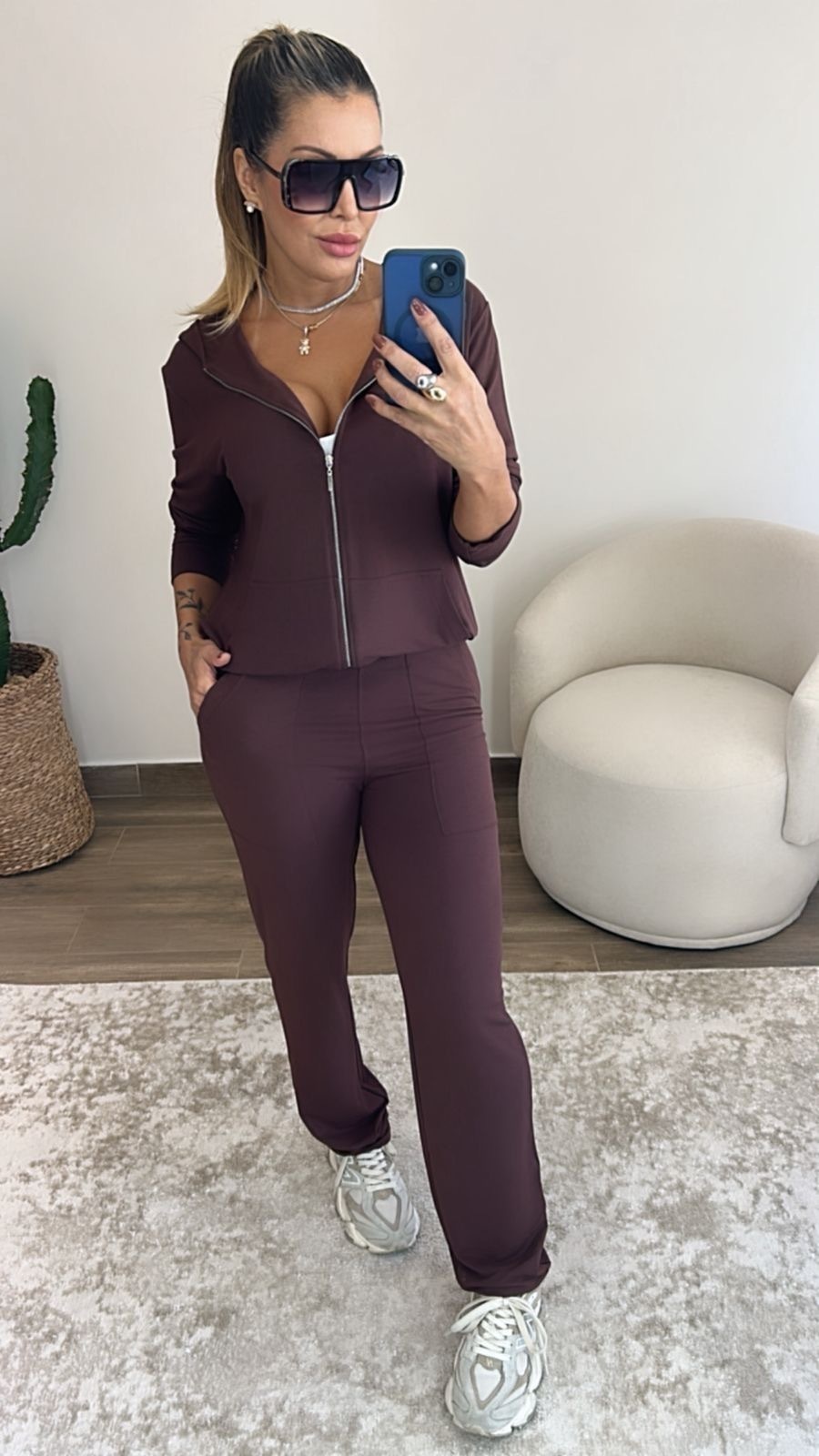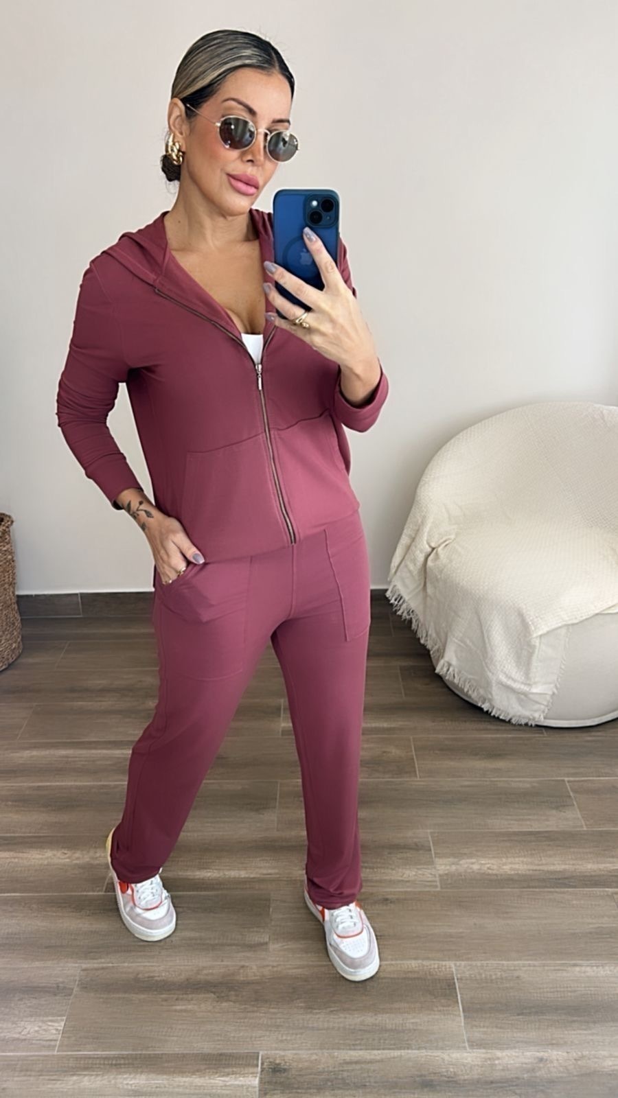 Conjunto em moletinho premium com blusa com zíper, bolso canguru e capuz