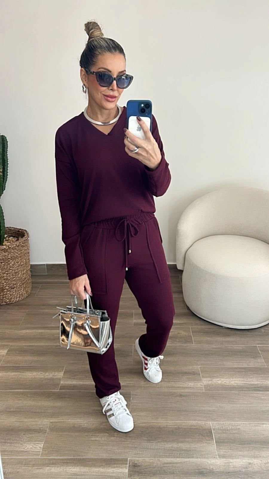 Calça com elástico na cintura , bolsos nas laterais e atrás e a calça é forrada
