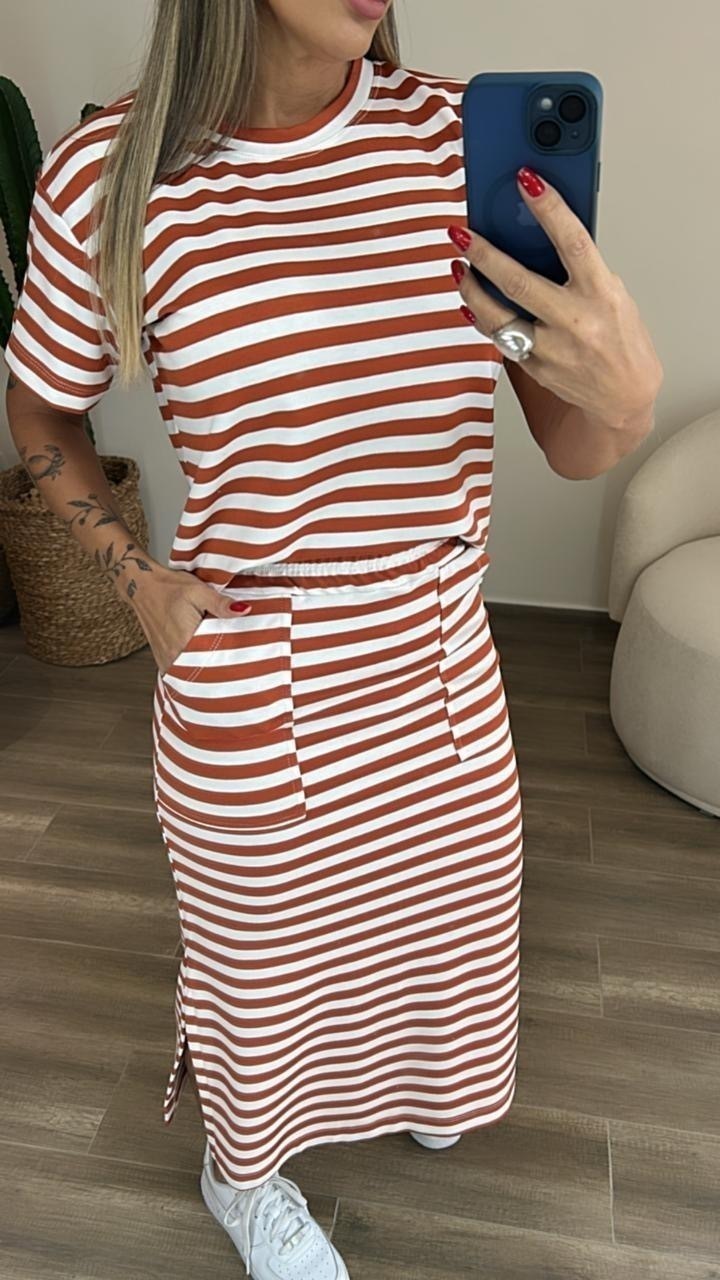 Conjunto listrado em moletinho premium de saia e blusinha Blusinha estilo T Shirts com manguinhaSaia com elástico na cintura, bolso e fendas laterais
