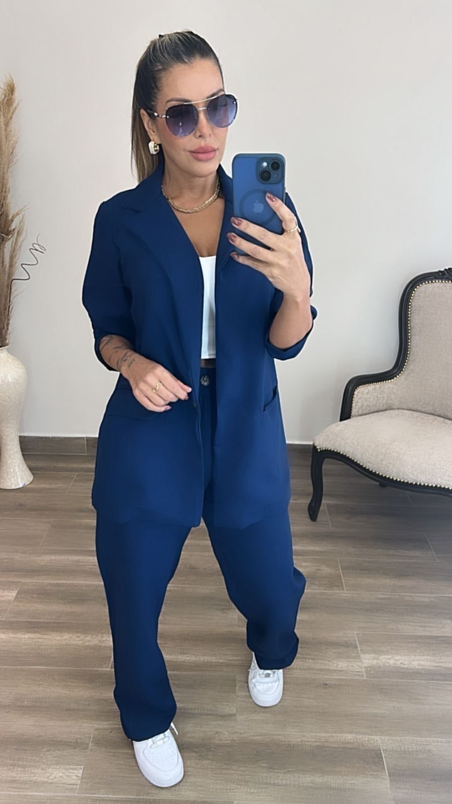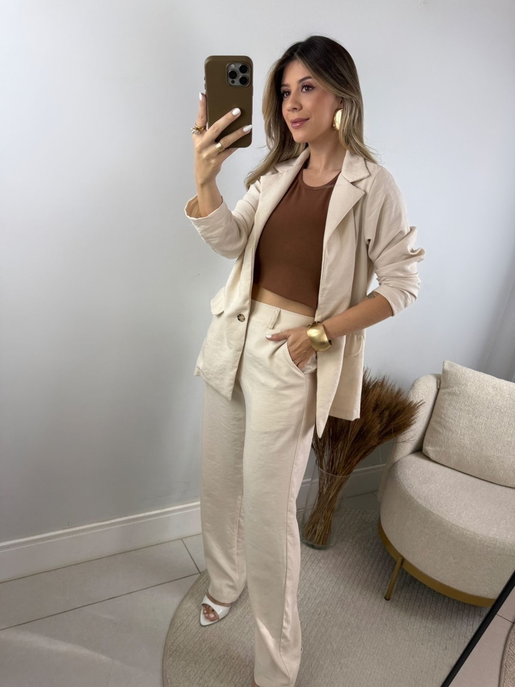 Calça com botão, ziper, elástico na parte de trás, passantes, bolsos nas laterais e atrás