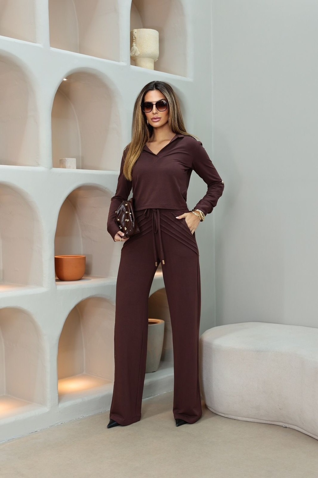 Conjunto em malha texturizada com bolsos nas laterais e atrás, detalhe na frontal na calça, elástico na cintura