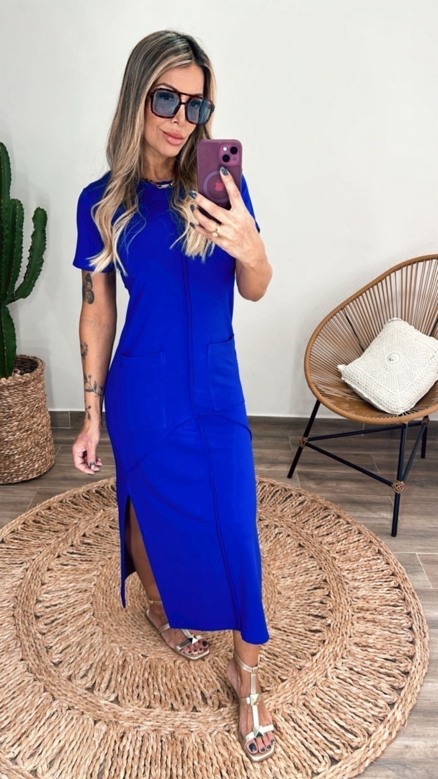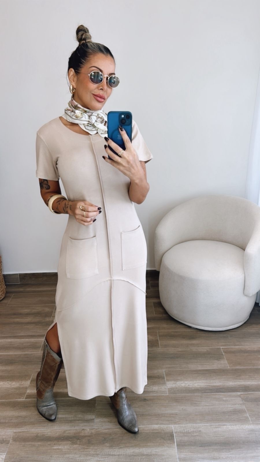 Vestido Joana em moletinho premium com recortes a fio, manguinhas que preservam os braços, bolsos frontais e fendas