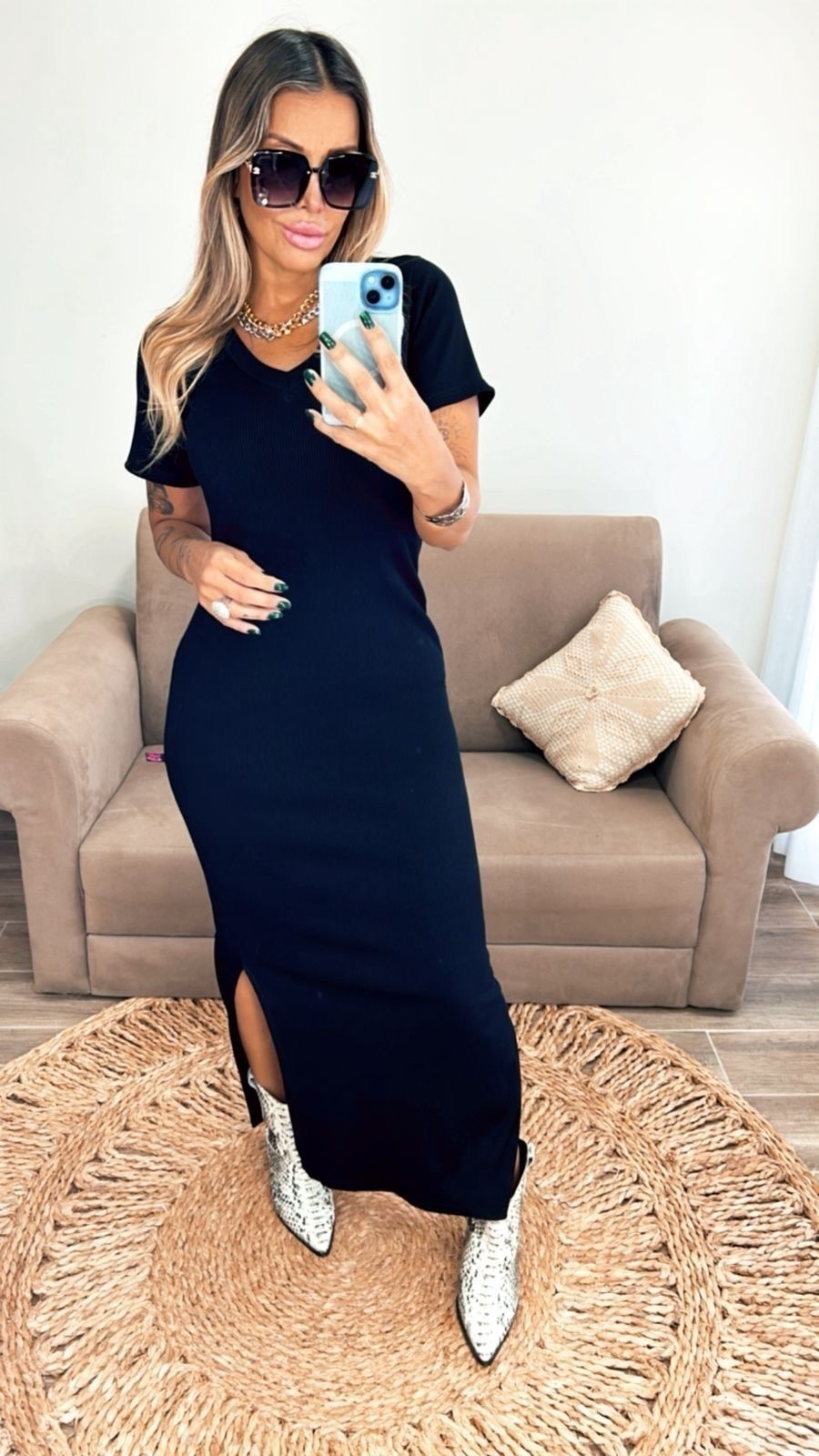 Vestido em malha Ribana canelada com manguinhas, decote V, e fenda