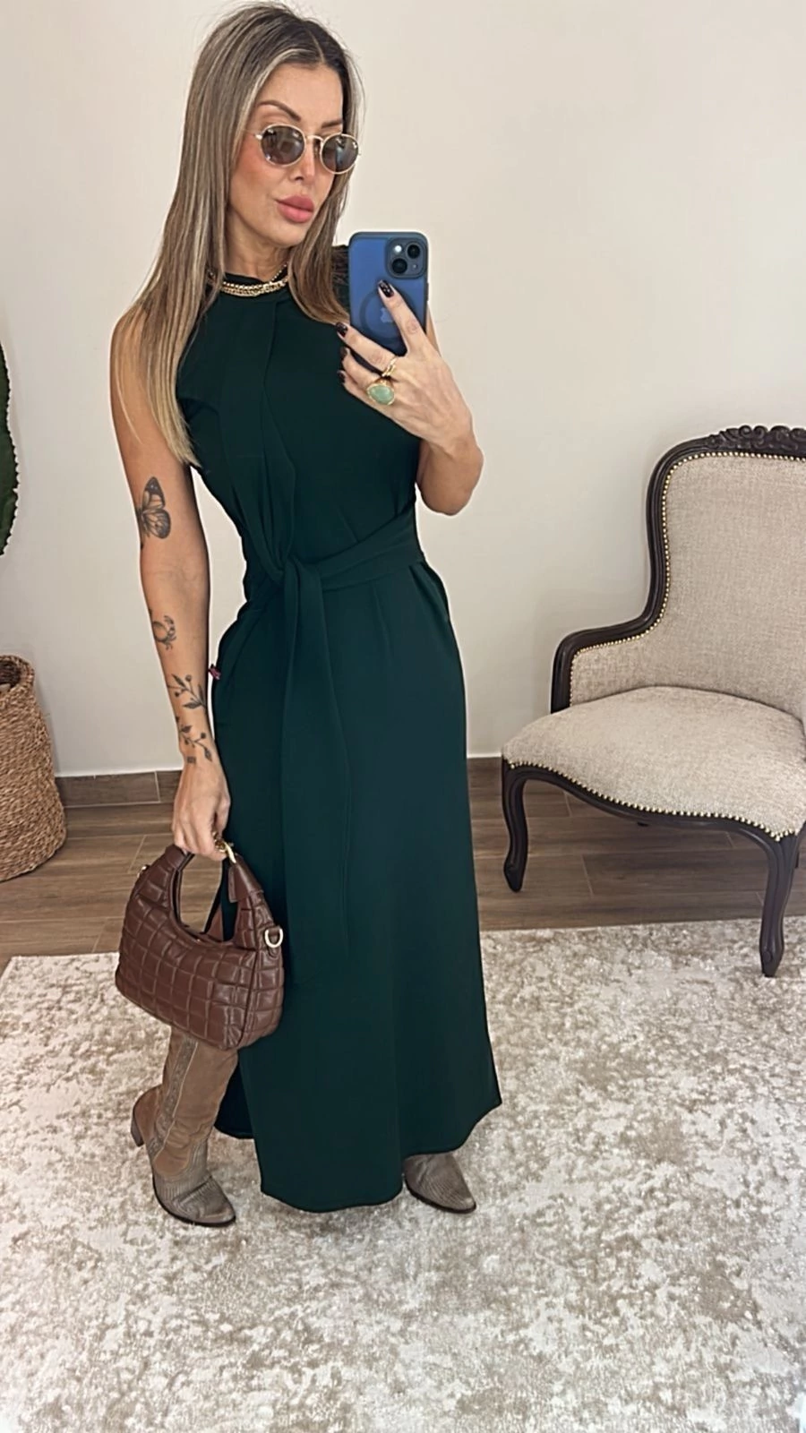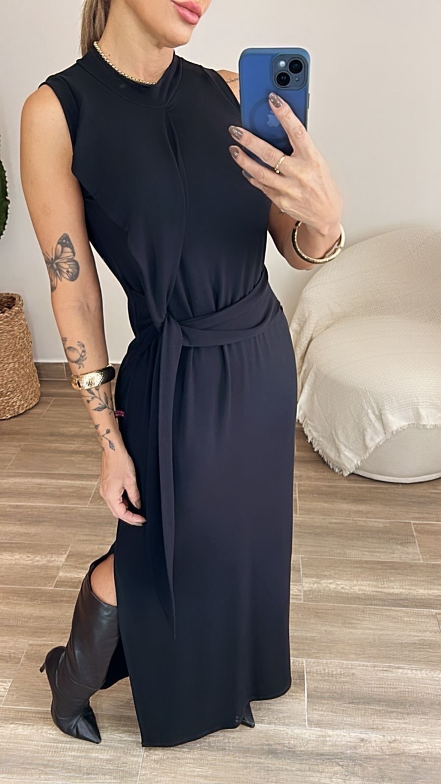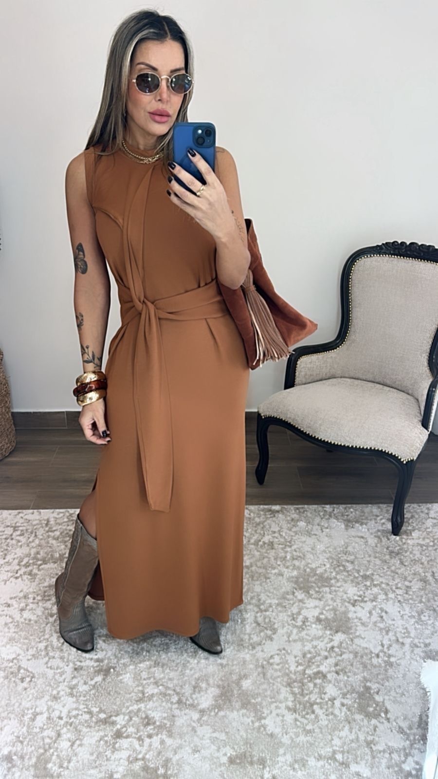 Vestido Marley em moletinho regata alças largas, com detalhe de amarrar e fenda