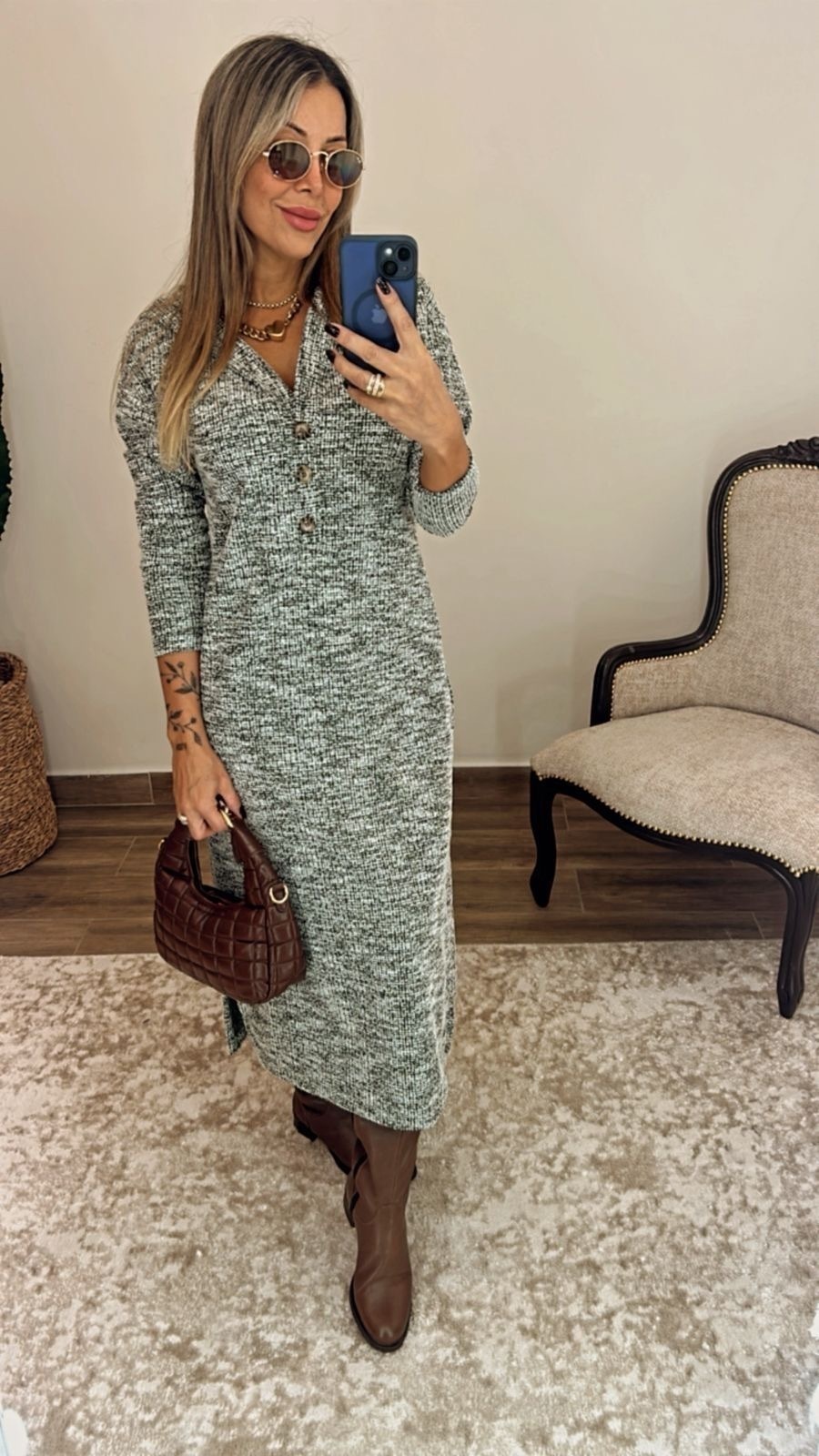 Vestido em tecido tweed cristal com mangas longas, botões, bolsos, capuz e fenda